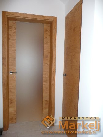 Notranja vrata hrast grča s prečno teksturo, skritim nasadilom in magnetno ključavnico. V utor lepljeno kaljeno jedkano steklo.