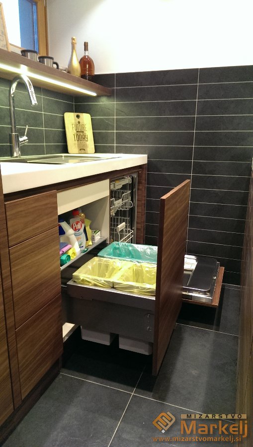 V kuhinjske elemente so vgrajeni namenski mehanizmi za ločevanje odpadkov, razvrščanje steklenic, notranji predali itd.
